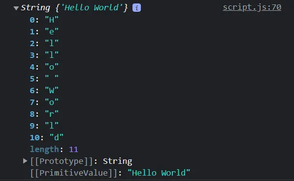 If you log the actual value of s, you will see an object and each character with a key/value pair. The first key or “index” is always 0. We can actually get a specific character by its index.