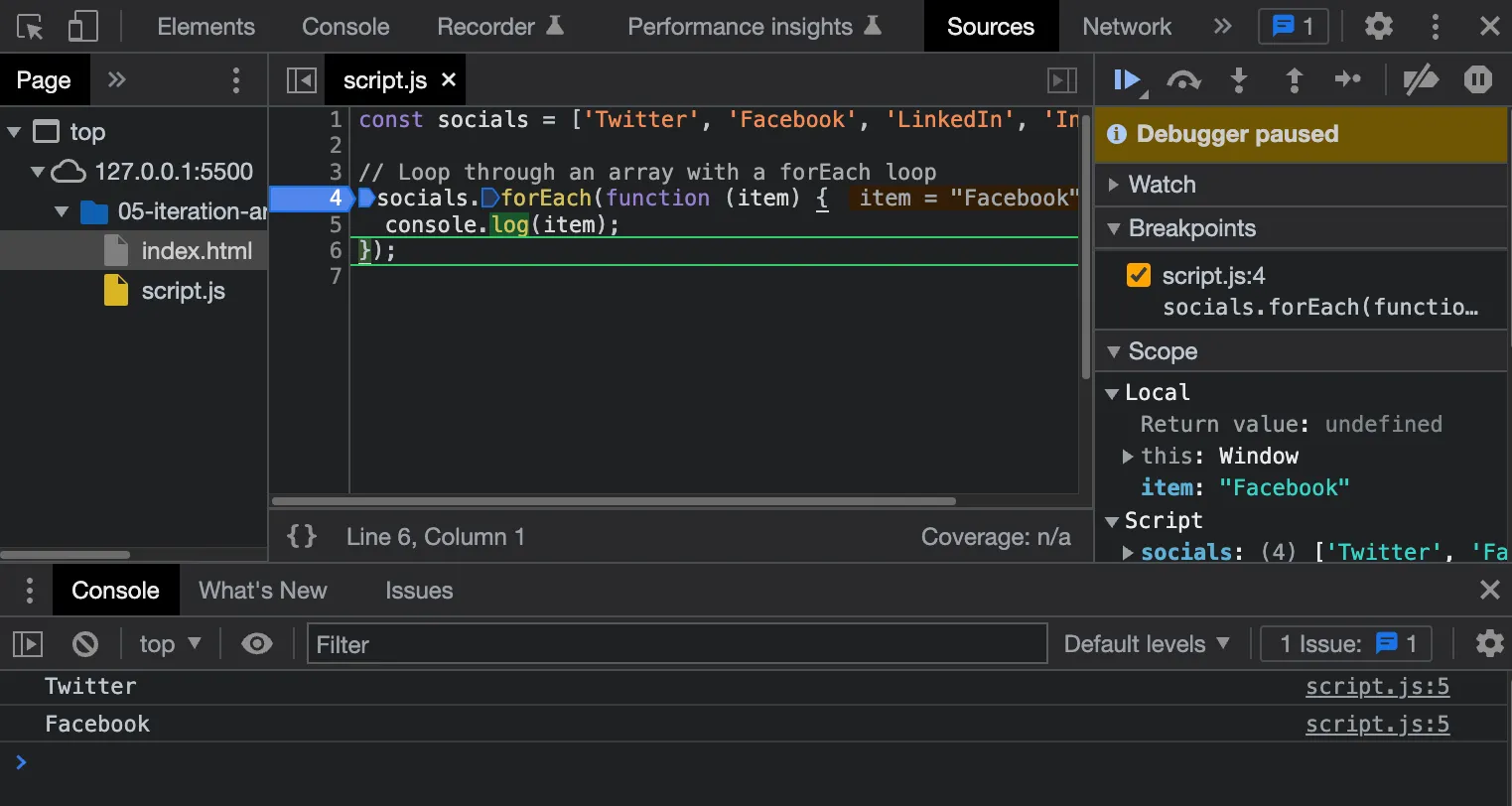We learned how to use the browser debugger when we learned about execution context. Let’s use it to see each time the callback is run. Place a breakpoint on the same line as the forEach. Hit esc to bring up the console window so you can see the output. Then hit the step through arrow. You will see it execute and log each item one at a time.