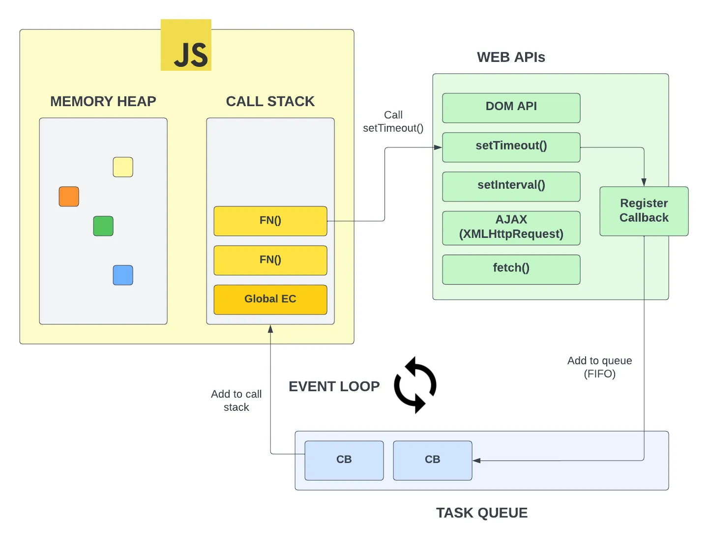 The yellow box represents the JavaScript engine. This is the part of the browser that executes our JavaScript code. This is where our call stack is that executes all of our functions, etc. This is also where the memory heap is, which is where all of our variables and objects are stored.