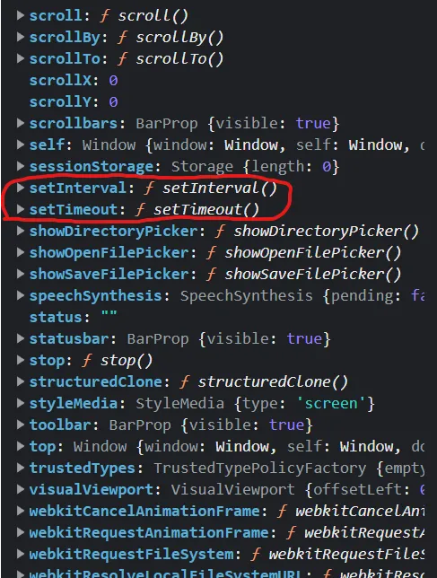 If we go to the browser console and type in window and hit enter, you will see setTimeout() and setInterval() and a bunch of other functions that allow us to do things asynchronously.