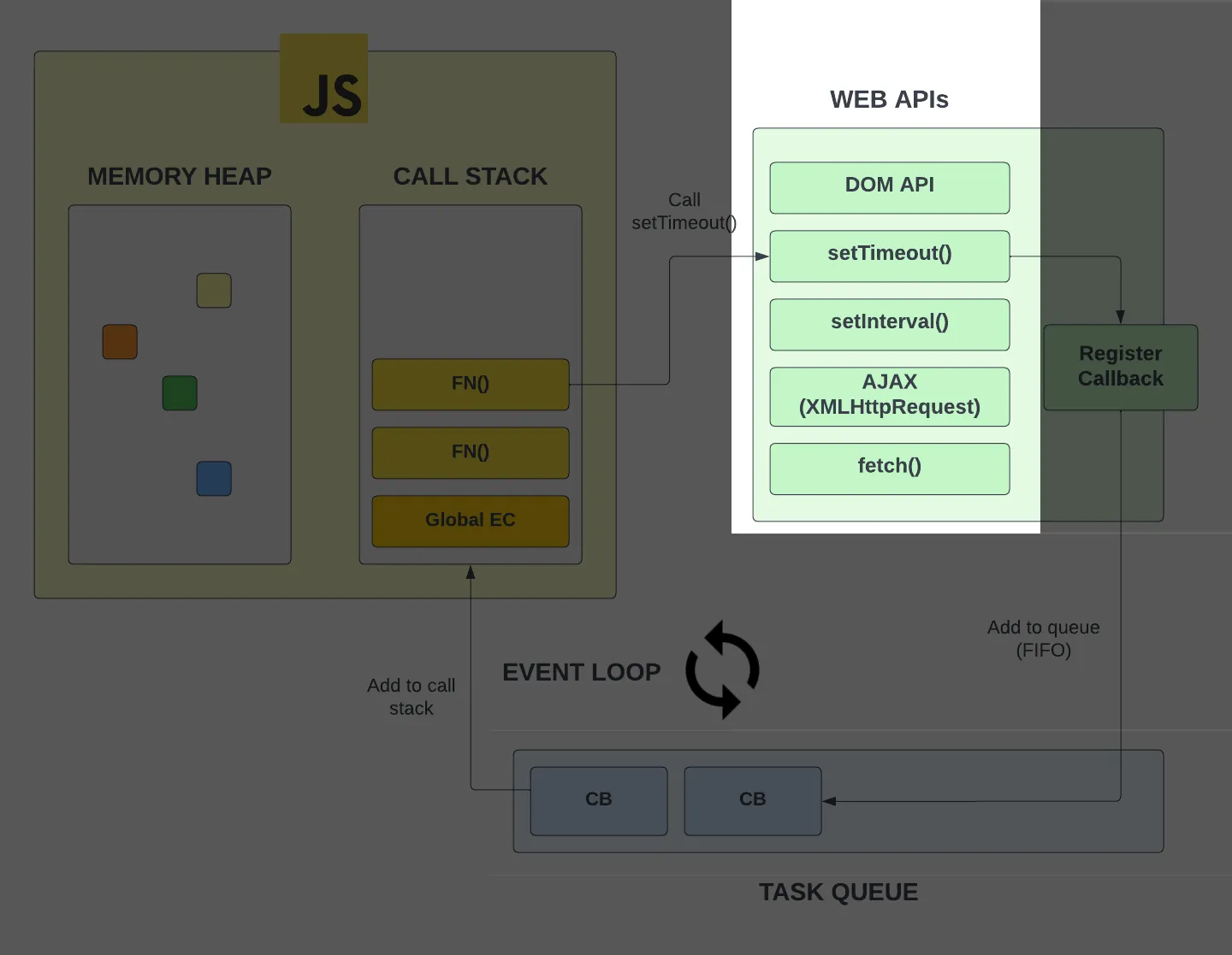 Outside of that, in the green box, we have a bunch of web APIs that are accessible to us via the browser and the global object. Remember, this is created during the creation phase of the global execution context.