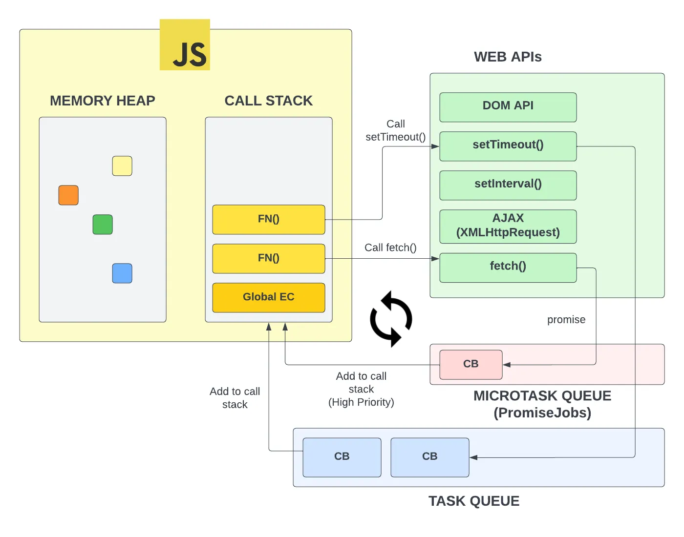 The yellow box represents the JavaScript engine. This is the part of the browser that executes our JavaScript code. This is where our call stack is that executes all of our functions, etc. This is also where the memory heap is, which is where all of our variables and objects are stored.